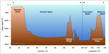 Профіль дна Північного Льодовитого океану від Баренцева моря до (географічного) Північного полюсу