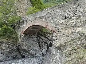 Нижня частини архівольту арки східного фасаду має округлі обриси, внаслідок чого ця частина зводу має кривину як у поздовжньому, так і в поперечному напрямках. Ця особливість моста надавала йому стійкості і міцності під час селевих потоків. Склепіння моста має еліптичний обрис. Завдяки цьому склепіння утворює сильно стиснуту з обох боків жорстку конструкцію[1].