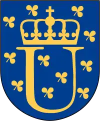 Герб: у синьому полі, всипаному золотими конюшиновими трилисниками, такий же сигль «U» під закритою короною.