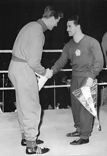 ![]() Ульріх Нітцшке (ліворуч) з Ласло Паппом обмінюються вимпелами під час міжнародної зустріі НДР - Угорщина у 1955 році | |