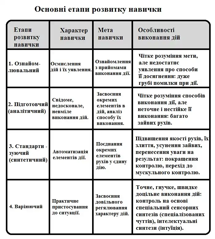 Навички-дії, складові частини яких у процесі формування стають автоматичними. Відповідно до видів дій розрізняють і види навичок: рухові, сенсорні, інтелектуальні. В усіх видах діяльності необхідні навички: навчальні, трудові, ігрові тощо.