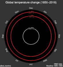 - Mooney, Chris (11 травня 2016). This scientist just changed how we think about climate change with one GIF. The Washington Post. Архів оригіналу за 6 February 2019. «Ед Гокінс взяв дані про щомісячну температуру і побудував по ним графік у вигляді спіралі, так що кожного року береться дванадцять точок, по одній на місяць, точки з теплішими температурами, розташовують далі від центру, а з холоднішими — ближче.»