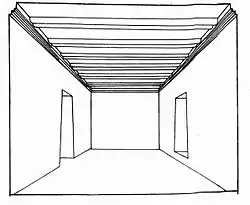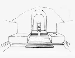 З портика восьмиступінчастими парадними сходами можна спуститися у великий, відкритий зверху зал, уздовж трьох стін якого знаходяться двоступінчаті сидіння для жерців. У залі, а також на майданчику перед портиком привертають увагу два круглі поглиблення, призначених для зливання крові жертовних тварин. Подібні ямки є в багатьох печерних комплексах Уплісцихе. Зустрічаються вони (частіше — чотирикутної форми) і в інших місцях.