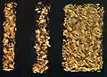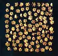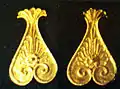Скарб був укритий в будові з глинобитною підлогою, контури якої так і не вдалося встановити, він лежав в дерев'яній скрині з чотирма бронзовими ніжками у вигляді бичачих копит, покритому саваном з товстої лляної тканини. Пів приміщення виявився суцільно засипаним золотими розетками, нитками, різноманітними намистами. Там же опинилися три пластинки досить крупних розмірів: одна з них має форму трикутної пальметки, а ще дві з зображенням квитків лотоса. Всі вони, поза сумнівом, прикрашали саван скрині, яка, розшитий і прикрашений так само, символічно зображав небо (квітка лотоса, пальметки і розетки мали символічне значення).
