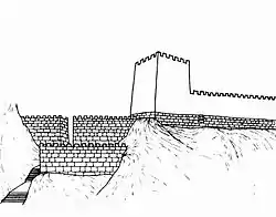 Стіна огорожі закінчується біля північно-західних і південно-західних воріт, оскільки з цих сторін місто було захищене прямовисною скелею, що не вимагала спеціального зміцнення.