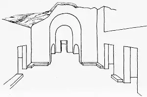 Праворуч від великих воріт можна побачити залишки культової башти, а попереду в скелі є отвір овально-купольного жертовника. Тут же починається головна вулиця, яка потім повертає направо, перетинаючи всю центральну частину міста в північному напрямі. Всі інші провулки та вулиці стікаються до неї. На ній же розташовано водостічний канал.