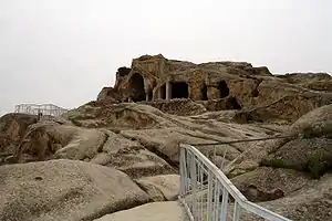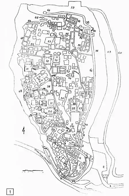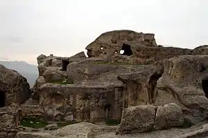 | ...нині зруйноване. Тут є будови незвичайні, висічені в скелі, зали великі, видовбані також у скелі, великий тунель, пробитий до річки Кури. На заході прямовисна скеля і всередині неї величезні печери, нині недоступні... це високе місце іменується Уплісцихе. |