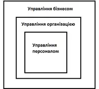 Управління персоналом стоїть у центрі управління організації. Управління організації стоїть в управлінні бізнесом. (схема «Знаходження управління персоналом»)