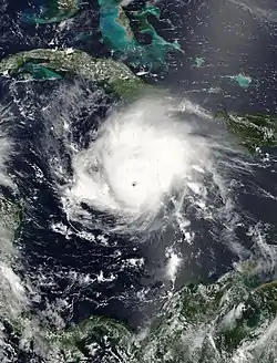 ![]() Мапа руху та інтенсивності урагану Емілі за шкалою Саффіра-Сімпсона. | ||||