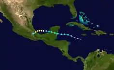 ![]() Мапа руху та інтенсивності урагану Карл за шкалою Саффіра-Сімпсона. | ||||