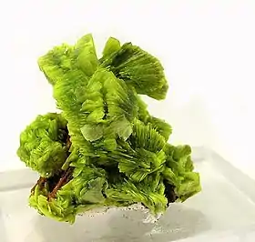 Сингонія тетрагональна. Дитетрагонально-дипірамідальний вид. Кристали голчасті, пластинчасті з квадратним обрисом. Листуваті, радіально-променисті, сноповидні аґреґати, кірки, Спайність досконала по (001), ясна по (100) та (010). Густина 3,5. Тв. 2,0-3,0. Колір зеленувато-жовтий. Розчиняється в HCl.