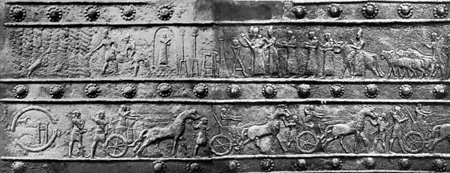 | Ліворуч — напис на фундаменті храму у фортеці Еребуні на пагорбі Арін-Берд біля Єревана. (Напис виконаний урартською мовою клинописом, запозиченим у ассирійців. Текст приписує побудову храму царю Аргішті I.) Праворуч — фрагмент бронзового Шолома епохи Сардурі II, на якому зображений популярний у давнину мотив «Дерева життя». (Шолом виявлено при розкопках фортеці Тейшебаїні на пагорбі Кармір-Блур.) | |