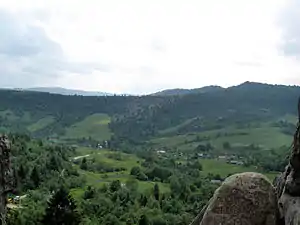 ![]() Панорама села і довколишніх гір (вигляд зі скель Тустань) | |