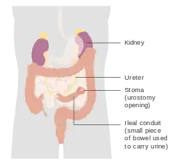 - Відведення сечі з клубової кишки, при якому сечоводи хірургічно резектовані із сечового міхура, та накладається уретероентеральний анастомоз для відтоку сечі у відокремлений відділ клубової кишки (частина тонкої кишки). Потім кінець клубової кишки виводять через отвір (стому) в черевній стінці. Сеча збирається у мішок, який кріпиться на зовнішній стороні тіла над стомою.