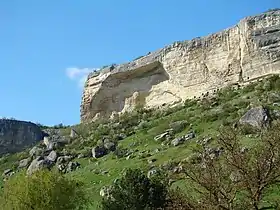 У верхів'ях ущелини, де мармуроподібні вапняки Кизил-Кая утворюють величезний природний напівцирк, височить туфовий майданчик, з якого в південно-західному напрямку відкривається мальовничий вид. Внизу — заросла лісом ущелина з річкою Су-Учхан і однойменним водоспадом, далі родюча долина верхів'їв Салгира. На горизонті — Головне гірське пасмо Кримських гір — від Пахкал-Кая на південному сході до Чатир-Дага на півдні і гори Таз-Тау на південному заході.