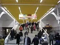 Стіни облицьовані білим мармуром. Кольорова гамма станції яскрава - серед спокійних і холодних кольорів білого мармуру дуже яскраво виглядають блакитні лінії на стінах, та жовта стеля. Взагалі, станція виконана у стилі хай-тек.