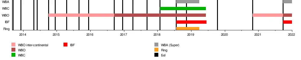 WBO (2016 — 2019) WBC (2018 — 2019) IBF (2018 — 2019) WBA (Super) (2018 — 2019) The Ring (2018 — 2019) у першій важкій вазі WBO (2021 — н.ч.) IBF (2021 — н.ч.) WBA (Super) (2021 — н.ч.) у важкій вазі. | |||