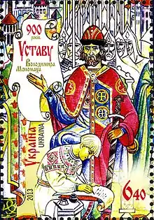 Блок «900 років Уставу Володимира Мономаха». Виконаний у візантійському стилі, що відповідає мистецькому стилю епохи того часу. На марці зображено князя та писаря.
