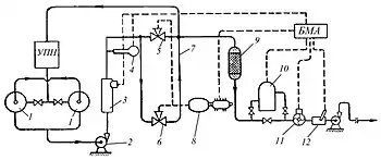 З установки підготовки нафти УПН нафта подається (рис.) в герметизовані резервуари 1, з яких забирається підпірним насосом 2 та проганяється через автоматичний вологомір 3 і солемір 4. Якщо вміст води і солей у нафті вищий за норму, то зонд вологоміра 3 видає аварійний сигнал у блок місцевої автоматики БМА, і за допомогою гідропривода 8 відсікач 5 перекриває лінію товарної нафти; одночасно відсікач 6 відкриває лінію некондиційної нафти, яка повертається по лінії 7 на повторну підготовку в УПН. Після припинення надходження аварійного сигналу з вологоміра 3 або солеміра 4 відсікач 5 відкривається, а відсікач 6 закривається. Потік товарної нафти проходить через фільтр 9, радіоізотопний густиномір 10, звідки надходить у турбінний витратомір 11, у якому обертається турбіна з кутовою швидкістю, пропорційною лінійній швидкості потоку. Обертання турбіни перетворюється в електричні імпульси, які потрапляють в рахунковий пристрій об'ємної кількості товарної нафти БМА.