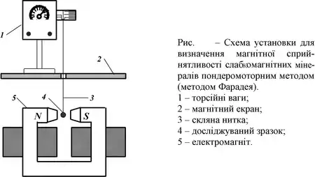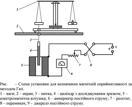 Установка для вимірювання магнітної сприйнятливості пондеромоторним методом (рис. 1) складається з електромагніту і ваг, якими вимірюється сила притягнення зразків.