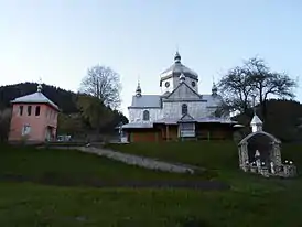Дерев'яна, невелика за розмірами, хрестова в плані, яку завершує один верх на середхресті нави, з піддашшям на випусках вінців зрубів. Західний і південний входи оформлені крильцями. Пропорції споруди високі. Весь простір інтер'єру підпорядковане монументально розкритому увись верху. З заходу до бабинця прибудували рівноширокий зашклений ґанок, з півдня до нави — менший ґанок. Захристія прибудована при східній стіні вівтаря. Над опасанням стіни суцільно оббиті бляхою з чеканкою, під опасанням зберегли з відкритого зрубу. Дерев'яна дзвіниця не збереглася[8].