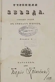 Утренняя звезда. Собрание статей в стихах и прозе. Книжка 2. X., 1833. На зв. тит. л.: Унив. тип., 1834. VII, 100 с.[1][2]
