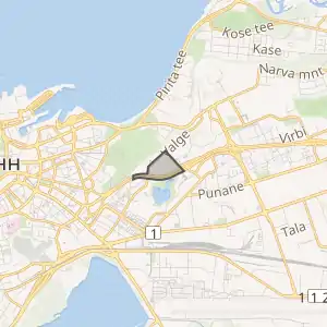 ![]() Територія мікрорайону (червоний колір) на фоні району Ласнамяє (жовтий). |
