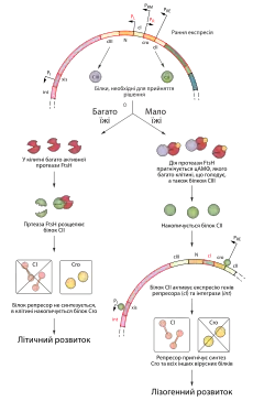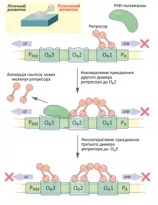 Одночасно внаслідок експресії ранніх генів у клітині накопичується білок Cro. Коли його рівень досягає критичного значення, він блокує подальшу транскрипцію власного та інших ранніх генів, оскільки до того часу їхні продукти вже синтезовані в достатній кількості.[5]