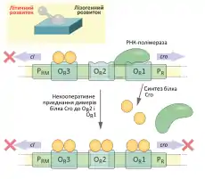 Якщо ж у клітині багато білка Cro, то він в першу чергу займе ділянку OR3, перешкоджаючи приєднанню РНК-полімерази до PRM і виключаючи таким чином можливість накопичення репресора. У випадку Cro ніякого кооперативного ефекту не спостерігається, тому для приєднання другої молекули до OR2 потрібна значно вища концентрація білка. На відміну від CI Cro в положенні OR2 не стимулює експресію власного гену, а навпаки — пригнічує. Це пов'язано із тим, що Cro не має ділянки для взаємодії з РНК-полімеразою, а також із тим, що OR2 розташований ближче до PR ніж до PRM, через що будь-який транскрипційний фактор, чи то CI, чи Cro, приєднуючись до нього перешкоджатимуть зв'язуванню РНК-полімерази із PR. Отже, коли в клітині накопичується достатня кількість Cro він «виключає» роботу раннього правого оперону. Таке явище спостерігається на пізній стадії літичного розвитку, коли нарепліковано вже достатньо копій вірусного геному, і необхідно перевести клітину на виробництво білків капсиду.