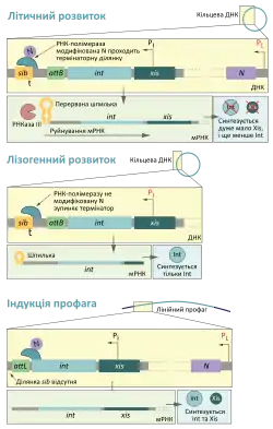 Продукт гену N працює як антитермінатор: разом із чотирма бактерійними білками він зв'язується із РНК-полімеразою і модифікує її таким чином, що вона набуває здатності проходити термінаторні ділянки і продовжувати транскрипцію. Модифікуватись може не будь-яка клітинна РНК-полімераза, а тільки та, що зв'язана із спеціальною послідовністю вірусної ДНК — nut (від англ. N utilization). Такі ділянки у геномі фага λ є тільки в двох місцях — перед термінатором tL лівого оперона та перед термінатором tR правого оперона, тому модифікації зазнають саме ті РНК-полімерази, які почали транскрипцію вірусної ДНК. Після цього відбувається експресія всіх генів, що входять до складу ранніх оперонів, найважливішими з них є O та P, які забезпечують реплікацію ДНК.