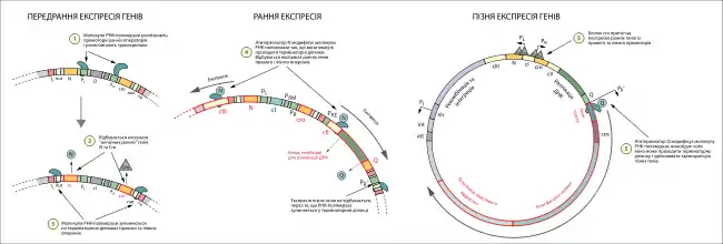 Наступною подією в циклі розвитку фага λ є розпізнавання його «ранніх» промоторів PR (правого) та PL (лівого) РНК-полімеразами живителя, які розпочинають транскрипцію. Утворені транскрипти зовсім короткі, оскільки РНК-полімерази, невдовзі по завершенню зчитування одного гена в кожному напрямку натрапляють на термінаторні ділянки (tR і tL), тому на цьому етапі експресуються тільки два так звані передранні або «негайні ранні» гени: N з лівого промотора і cro (англ. control of repressor and other genes) — з правого.