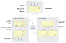 Фаг лямбда належить до помірних бактеріофагів. На відміну від вірулентних або літичних бактеріофагів, які після інфекції обов'язково перетворюють клітини на «фабрику» продукування нових віріонів, а згодом руйнують її, помірні фаги мають вибір: за сприятливих умов вони розвиваються літичним шляхом, тобто поводять себе схоже до вірулентних, а за нестачі енергетичних ресурсів може реалізуватись інший — лізогенний шлях розвитку, коли фаг перетворюється у латентну «дрімаючу» форму — профаг. За певних умов профаг може активуватись і переходити до літичного розвитку, такий перехід називається індукцією профага.[7]