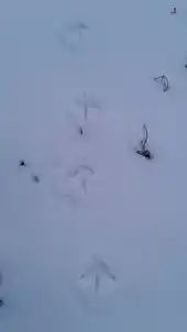 Слід фазана, перекошений — палець II явно коротший, ніж палець IV. Палець I дуже зменшений, тож іноді його не помітно на стежці. Загальна довжина сліду, зазвичай 65-75 мм, ширина 60-65 мм.