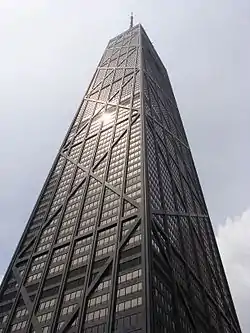 - 1966—1969 — John Hancock Center, Чикаго. В основі проєкту — пропозиція Мікіо Сасаки, в ті роки ще студента. Перша в світі висотна будівля — зрізана піраміда з діагональними брусами; на момент будівництва — друга за висотою будівля у світі.[5]