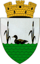 Герб, прийнятий в 1936 році, виглядає в такий спосіб: «У срібному полі на зелених хвилях чорна качка, а по краях два чорних стебла. Щит увінчаний срібною міською короною з 3 вежами».[2]