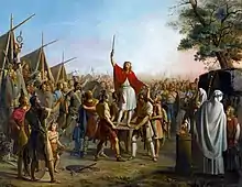 | Вони покинули Сікамбрію, прибули до лежачих на найвіддаленіших [місцях по] Рейну містах Німеччини і зі своїми ватажками Маркоміром, сином Пріама, і Сунно, сином Антенора, оселилися там, тут жили вони довгі роки. Після смерті Сунно прийшли вони до висновку, наслідуючи приклад інших народів, вибрати собі короля. І Фараміра порадив їм це, і, таким чином, вони вибрали його сина, Фарамунда, своїм королем з кучерявим волоссям. <…> Після смерті короля Фарамунда обрали вони королем з кучерявим волоссям його сина Хлодіона в державі його батька. (Книга 1, розділ 4-5). |