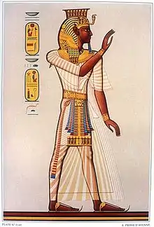 - Корона існувала в багатьох варіантах. Найбільш вживана подвійна корона «пшент» складалася з червоною корони Нижнього Єгипту «дешрет» і білої корони Верхнього Єгипту «хеджет». Кожна з цих двох корон належала також богиням-покровителькам цих частин країни — відповідно Уаджит, богині-кобрі, і Нехбет, яка шанувалася у вигляді стерв'ятника. Зображення Уаджит (урей) і Нехбет прикріплялися до корони спереду. Рідше надягали синю корона хепреш (для військових походів), золоту корону Хаїт (для ритуальних обрядів), діадему сешед (в епоху Стародавнього царства), а також інші головні убори на кшталт корони хемхемет, яка частіше зустрічаються на зображеннях богів, ніж фараонів.