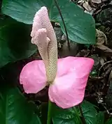 Фасціації суцвіть і квіток: 1) розщеплення початку антуріума; 2) деформація суцвіття-кошика королиці; 3) суцвіття півнячого гребеня садового; 4) подвоєння квітки нарциса Narcissus x medioluteus; 5) суцвіття цвітної капусти. | ||||||||||