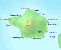 Назва острова українською мовою перекладається як «буковий ліс», проте місцеве населення часто називає острів «синім». Острів з його головним морським портом у місті Орті набули важливого стратегічого значення відразу після відкриття, — завдяки своєму вигідному географічному розташуванню він став проміжним пунктом на шляху між Америкою та Європою. Клімат острова є вологим (відносна вологість повітря тут майже завжди перевищує 79%), з місячною температурою взимку — 13 °C, влітку — 22 °C.