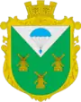 У зеленому полі срібне перекинуте укорочене вістря, в якому синій парашут; під ним – 3 золоті вітряки (2:1). Герб облямований золотим картушем і увінчаний золотою сільською короною.