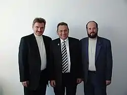 Голова Трудової партії України Михайло Сирота, керівник виборчого штабу Блоку Бориса Олійника та Михайла Сироти у Кіровоградській області В'ячеслав Чебишев та Андрій Федур, місто Олександрія, 21.01.2006 року