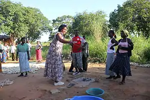 Селяни під час вправи йдуть до місця приготування їжі, щоб спостерігати, як мухи злітаються на людські фекалії та переносять хвороби шляхом приземлення на їжу. (Малаві).