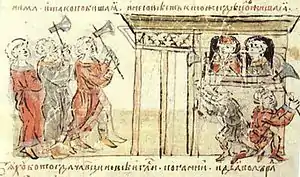 І сказали старці і бояри: "Кинемо жереб на хлопця і дівчину, на кого він упаде, того й заріжемо в жертву богам ". Був тоді варяг один, а двір його стояв там, де зараз церква святої Богородиці, яку побудував Володимир. Прийшов той варяг із Греків і сповідував християнську віру. І був у нього син, прекрасний особою і душею, на нього-то і жереб упав, по заздрості диявола. Бо не терпів його диявол, який має владу над усіма, а цей був йому наче терен у серці, і прагнув погубити його окаянний і нацькував людей. І послані до нього, прийшовши, сказали: «На сина твойого упав жереб, обрали його собі боги, так учинимо жертву богам». І сказав варяг: "Не боги це, а дерево: нині є, а завтра згниє; не їдять вони, не п'ють, не говорять, але зроблені руками з дерева. Бог же один, йому служать греки і поклоняються; сотворив він небо, і землю, і зорі, і місяць, і сонце, і людину і присвятив його жити на землі. А ці боги що зробили? Самі вони зроблені. Не дам сина свого бісам ". Пішовши, повідали про все людям. Ті ж, взявши зброю, пішли на нього і рознесли двір. Варяг же стояв на сінях із сином своїм. Сказали йому: «Дай сина свого, та принесемо його богам». Він же відповів: "Якщо вони боги є, то нехай пошлють одного з богів і візьмуть мого сина. А ви-то навіщо приносите їм жертви? ". І кликнули, і підсікли під ними сіни, і так їх убили. . І не відає ніхто, де їх поклали— Повість временних літ на сайті «Давньоруська література»