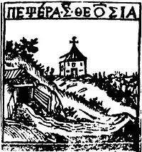 ![]() Антоній і Феодосій при Успенськім соборі й іконі Успіння пресвятої Богородиці. Гравюра Іллі. Патерик. 1661 рік. |
