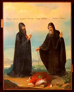 Преподобний Феофан Печерський та колишній князь Микола Святоша, який зрікся князівських почестей і прийняв постриг у лаврі.