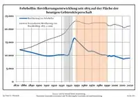 Динаміка населення з 1875 року в сучасних кордонах (Синя лінія: населення; Пунктир: відносна порівняльна динаміка населення землі Бранденбург; Сірий фон: період Третього рейху; Помаранчевий фон: період НДР)