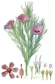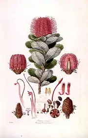 Ботанічні ілюстрації роботи Ф. Бауера з книги «Illustrationes Florae Novae Hollandiae»: Grevillea banksii, Banksia coccinea Alyogyne hakeifolia Stylidium violaceum. | ||||||||||