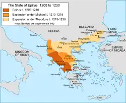 Після захоплення Константинополя хрестоносцями у квітні 1204 року Візантійська імперія розпалась та була розділена між лідерами хрестоносців та Венеціанською республікою. Латинська імперія утворилась в самому Константинополі, тоді як більшість північних та західних земель в континентальній Греції відійшли Королівству Фессалоніки під керівництвом Боніфація I Монферратського.[3][4] Одночасно виникли дві основні візантійські грецькі держави, які суперничали за вплив з латинянам і претендували на спадщину Візантії, а саме Нікейська імперія з лідером Феодором I Ласкарісом в Малій Азії, та Епірський деспотат у західній Греції з Михайлом I Комніном Дукою, тоді як третя грецька держава, Трапезундська імперія, розміщувалась на північному сході Анатолії та не брала участі у боротьбі за Грецію.[5][6] Михайло І Комнін Дука швидко розширив свої володіння на Фессалію, а його наступник Феодор Комнін Дука захопив Фессалоніки в 1224 році.[7][8]
