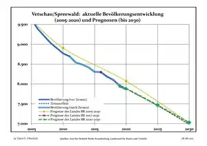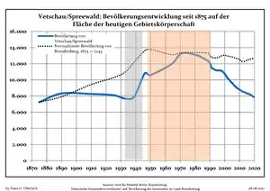 Динаміка населення з 1875 року в сучасних кордонах (Синя лінія: населення; Пунктир: відносна порівняльна динаміка населення землі Бранденбург; Сірий фон: період Третього рейху; Помаранчевий фон: період НДР)