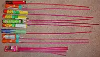 - Багаторозривні мушлі (multi-break shells) — букети різних типів і розмірів кольорових, іскристих зірочок або комет.